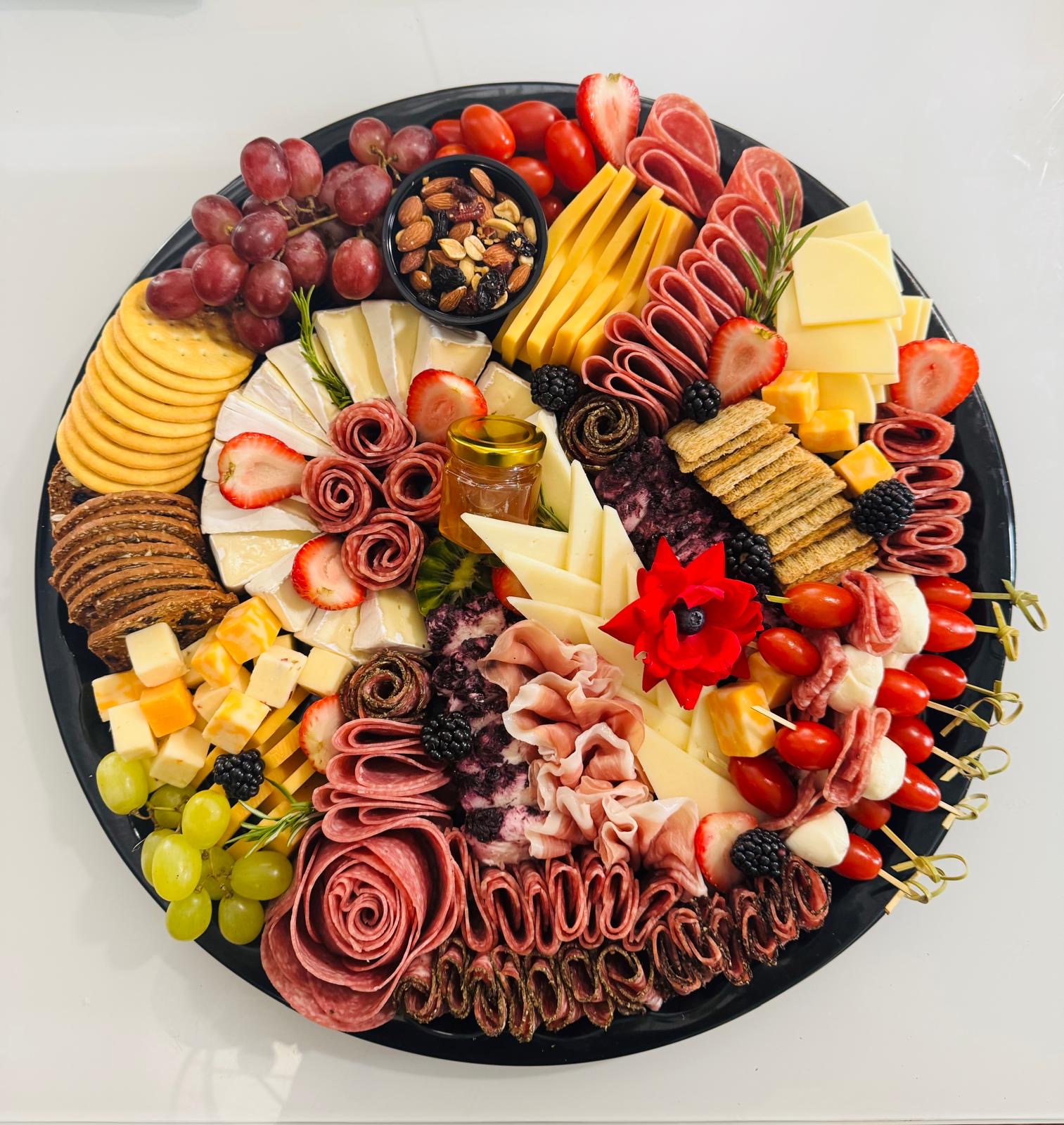 This is one of our Luxury tables. Premium cheeses and meats. Crackers with rosemary and raisins flavors, juicy grapes. It comes with tomatoes and cheese skewers. It’s up to 15-18 People.