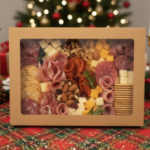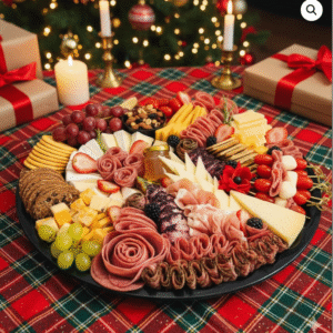 This is an amazing charcuterie board with some different ingredientes like: Brie, Colby, parmesan and pepper jack cheeses. Selections of crackers, strawberries, grapes, rolls of ham and salami, and a touch of hard chocolate. It’s Up to 6-8 people.